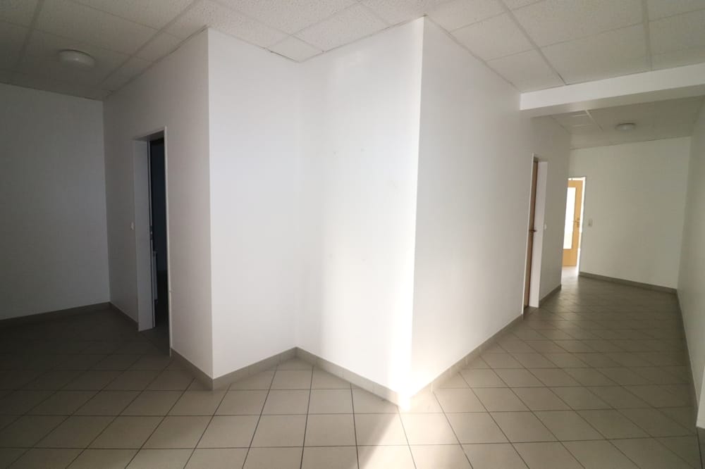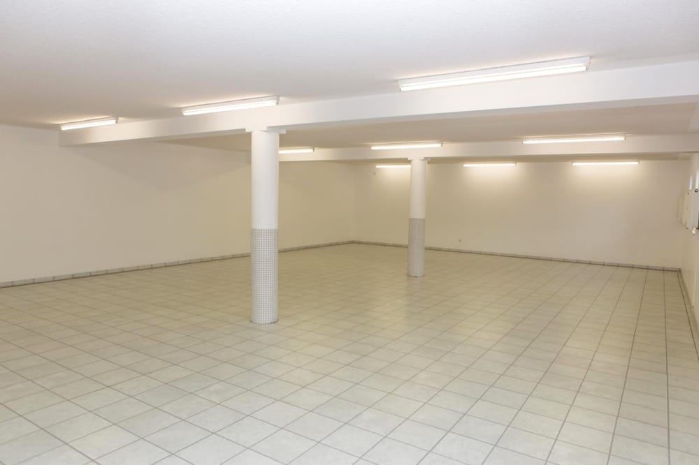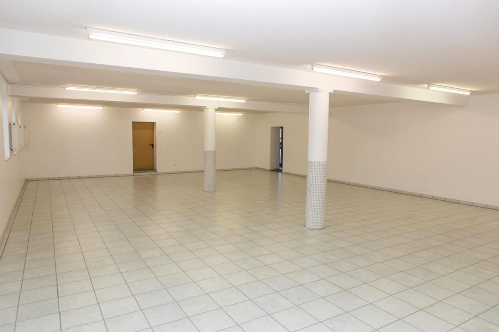 Die Gewerbeeinheit verfügt über einen hellen einladenden Eingangsbereich, einen rund 135 m² großen Hauptsaal, eine Küche, zwei Lagerräume, getrennte Damen- und Herrentoiletten sowie einen Duschraum. Zusätzlich stehen vier Büroräume mit Flächen zwischen ca. 9 m² und 42 m² zur Verfügung. Die Räume sind hell gefliest und mit Schallschutzwänden ausgestattet.
