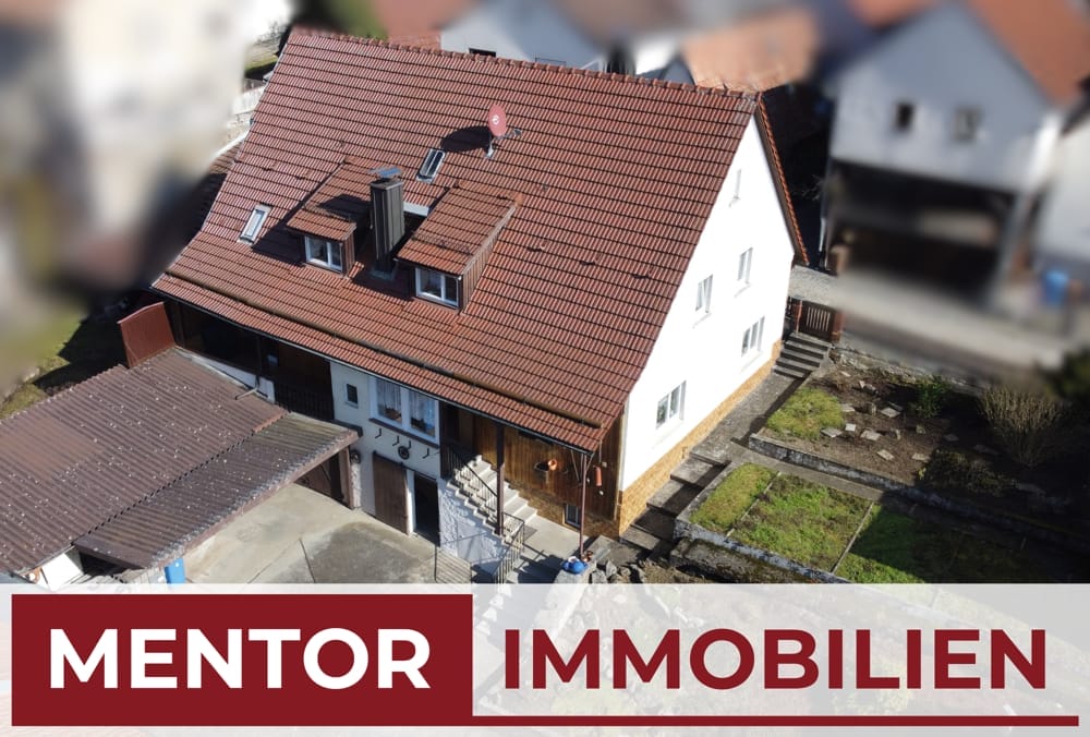 Im Erd- und Obergeschoss (Dachgeschoss) stehen insgesamt 9 Zimmer sowie Küche, Bad, 2 WCs und ein Balkon zur Verfügung. Ergänzend gibt es einen großen Spitzboden, Kellerräume (ca. 2/3 des Hauses unterkellert), zwei Garagen, eine Holzhalle sowie Hof- und Gartenflächen.