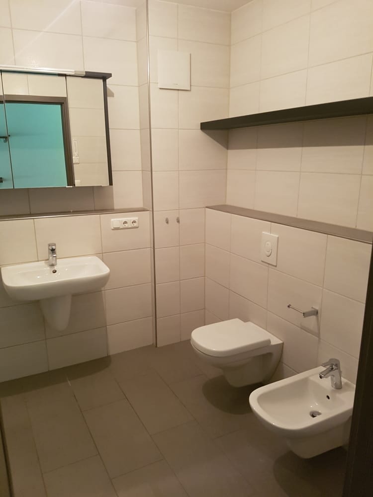 Das großzügige Badezimmer ist mit einer ebenerdiger Dusche, Bidet, Handtuchhalter sowie einem Spiegelschrank ausgestattet.
